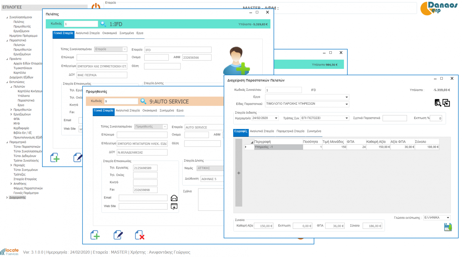 Danaos ERP Εμπορική διαχείριση. Το σύστημα παρέχει μία ολοκληρωμένη λύση λογισμικού εμπορικής διαχείρισης πολλαπλών χρηστών με ενσωματωμένες λειτουργίες ηλεκτρονικής αρχειοθέτησης για το σύνολο των εγγράφων σχετικά με τις δραστηριότητες της